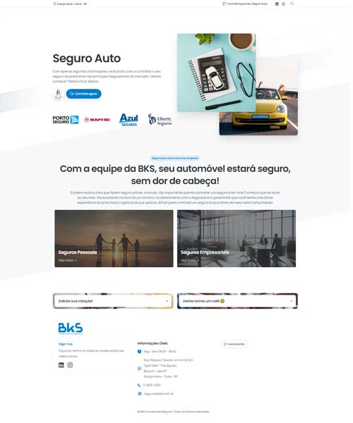A BKS Corretora de Seguros nos procurou com a necessidade de modernizar sua presença online e criar um site que oferecesse uma experiência de usuário ainda mais clean e responsiva. Nosso objetivo foi desenvolver um site que combinasse um design moderno, funcionalidades avançadas e otimização para mecanismos de busca, refletindo o compromisso da BKS em oferecer soluções de seguro personalizadas e um atendimento diferenciado.